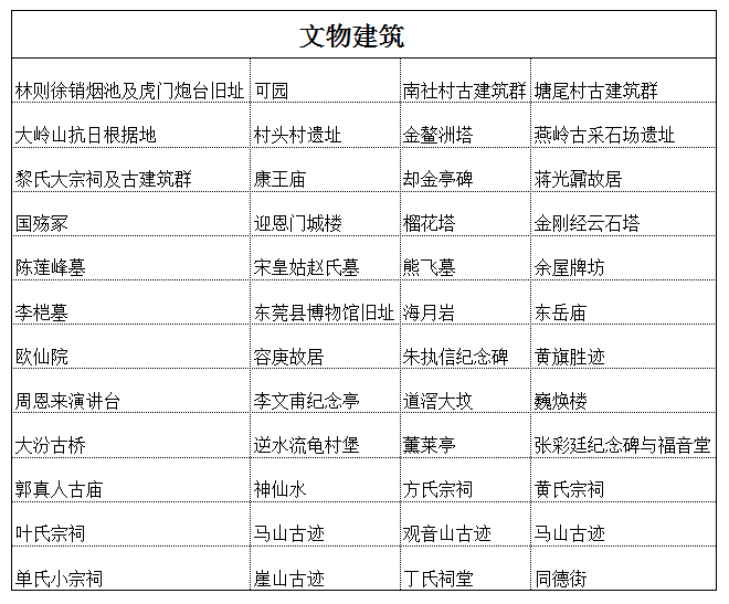 东莞市是广东省历史文化名城,岭南古邑,名胜古迹甚多,东莞博物馆珍藏有村头遗址等新石器时代以来的出土文物。有中外闻名的林则徐销烟池、沙角炮台、威远炮台等抗英古战场遗址,有鸦片战争博物馆、海战馆等爱国主义教育基地;抗日战争时期这里是东江人民的根据地,大岭山抗日史实陈列馆和榴花抗日纪念亭。人文景观有著名古刹观音寺、金鳌洲塔和榴花塔、广东四大名园之一的可园、袁崇焕故居、黄旗古庙等。自然风景有仙鹅湖、石排燕岭、东莞植物园、清溪山水天地以及珠江口滨海秀色、稻海蕉林,荔红荷香,旗峰胜迹等。